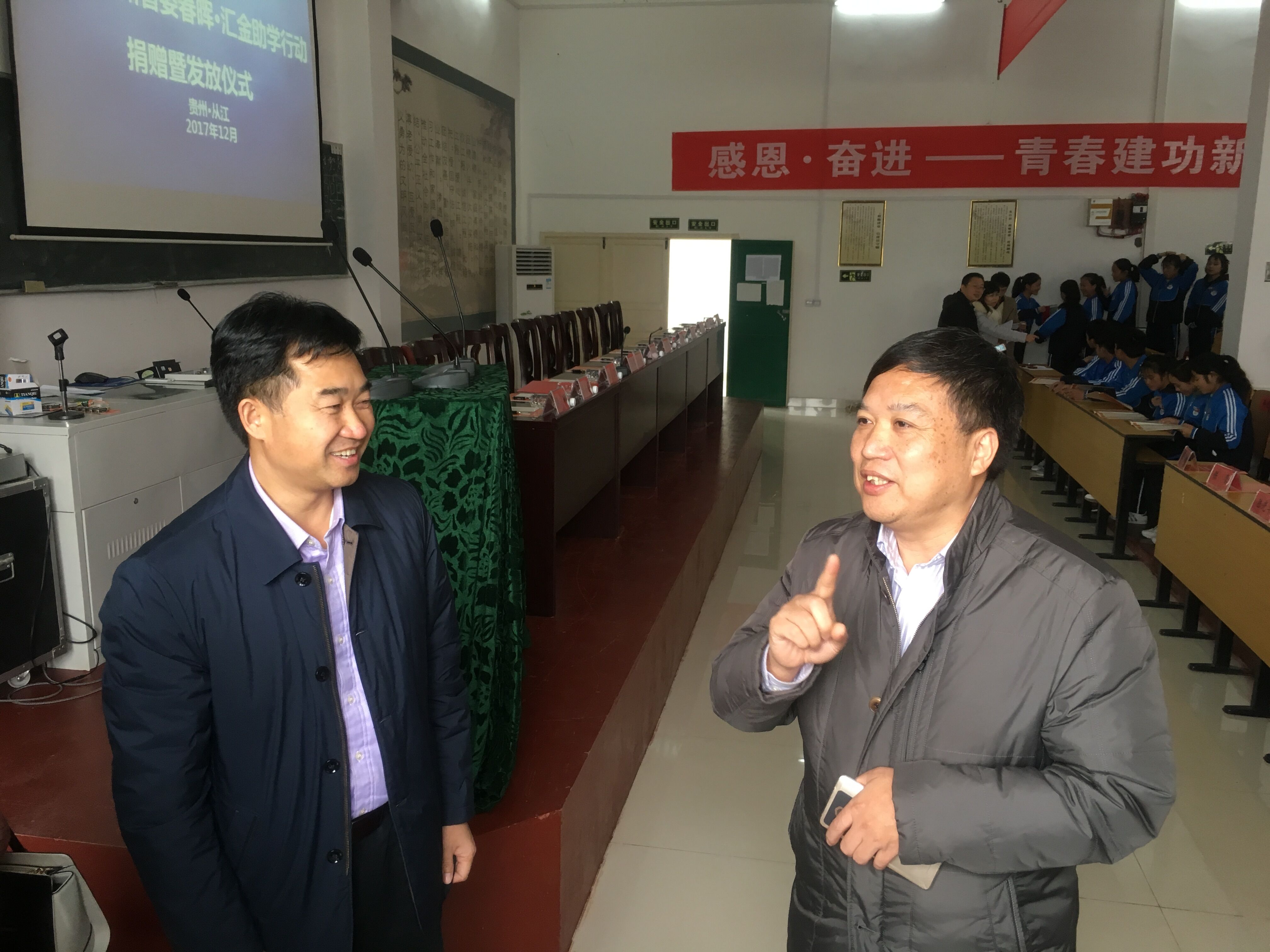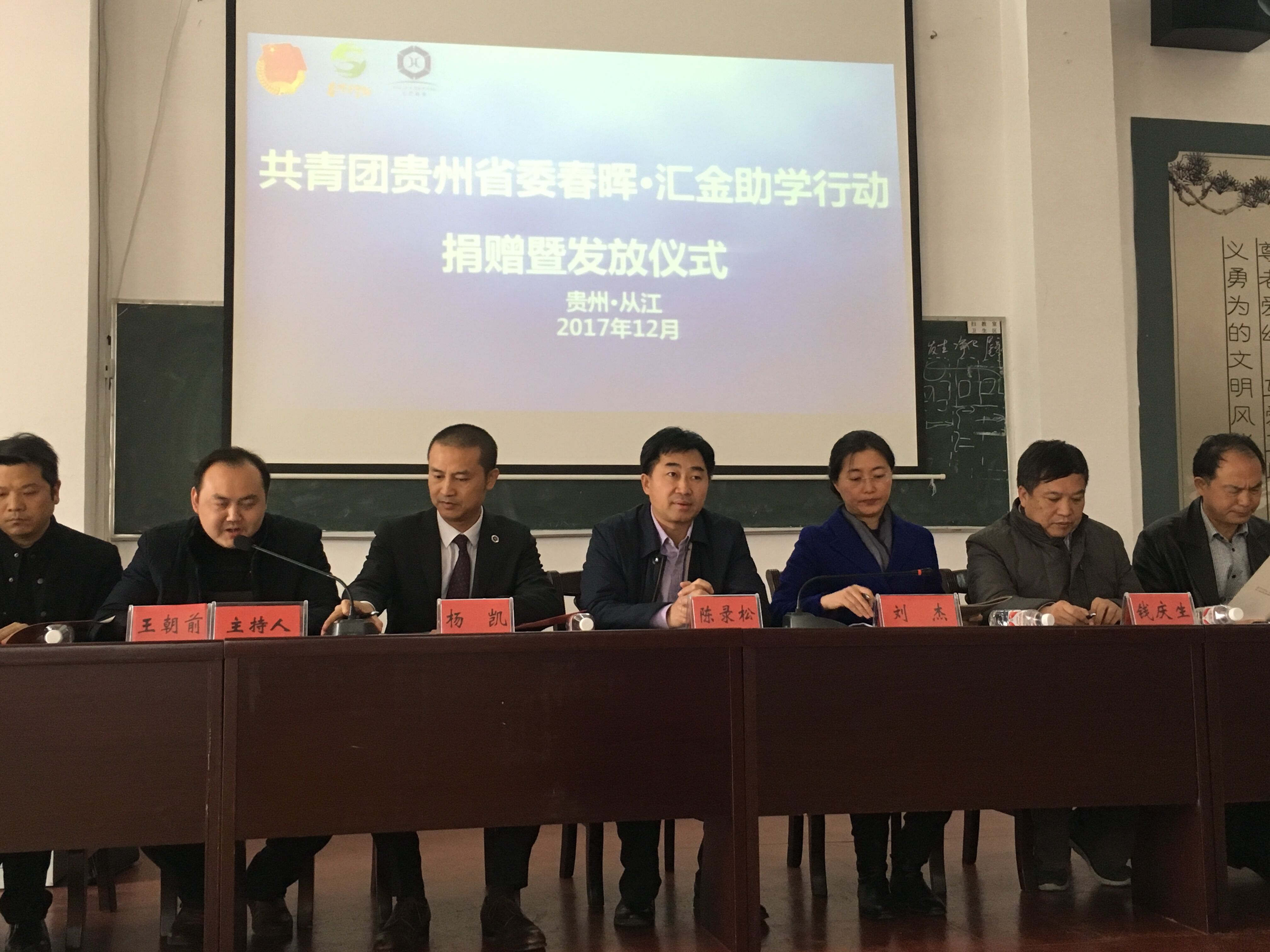 12月8日,共青团贵州省委“春晖•汇金助学行动”捐赠暨发放仪式在从江县隆重举行,共青团贵州省委党组成员、专职纪检员刘杰、贵州职业技术学院副校长钱庆生、中共从江县委副书记陈录松、深圳汇金搏达控股、贵州世纪汇金集团董事长杨凯、贵州世纪汇金集团执行总裁肖琍等参加此次捐赠活动。