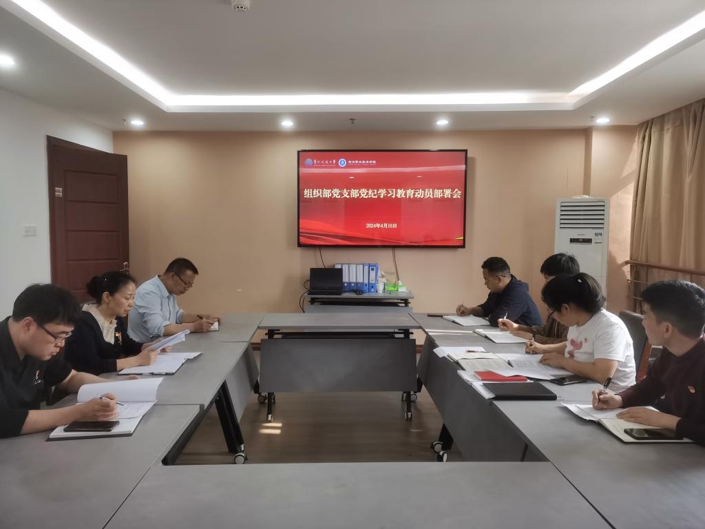 2024年4月16日,组织部党支部召开党纪学习教育动员部署会,会议传达学习了习近平总书记关于党纪学习教育的重要讲话和重要指示精神,学习了中央党的建设工作领导小组会议研究部署党纪学习教育工作会议精神、省委常委会研究部署开展党纪学习教育会议精神、省委党的建设工作领导小组全面动员部署全省党纪学习教育工作会议精神、学校开展党纪学习教育动员部署会议精神和《关于在全校开展党纪学习教育的实施方案》。支部书记张仁俊主持会议并作动员讲话,机关党委书记周涛列席会议,组织部党支部全体党员参加会议。
