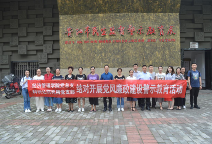 2019年6月15日下午,经济管理学院党总支和科研处、研究所结对前往贵阳市民生警示基地进行警示教育活动。经济管理学院党总支书记丁萍、党总支副书记、院长黄伟春、副院长罗红霞,科研处、研究所卿云、科研处研究所副所长何国伟以及支部全体党员参加了此次活动。